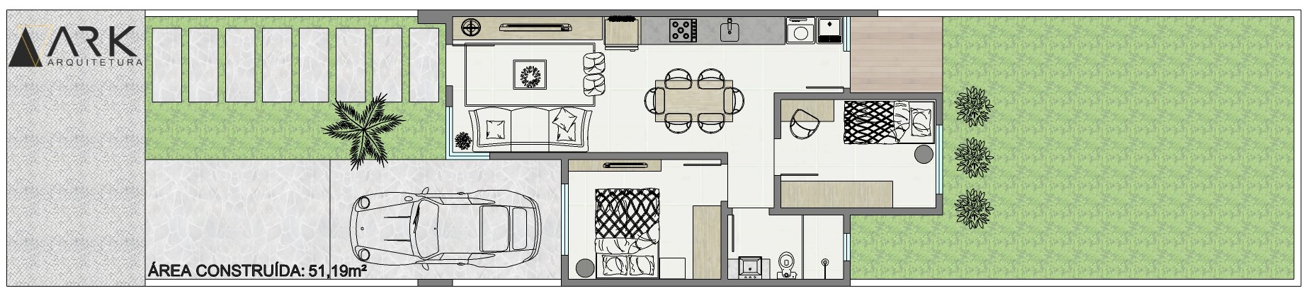 Projeto moderno e compacto ideal para terrenos estreitos de 6 metros de largura, oferecendo uma excelente distribuição em 51m² construídos. Perfeito para quem busca conforto, praticidade e aproveitamento inteligente dos espaços.