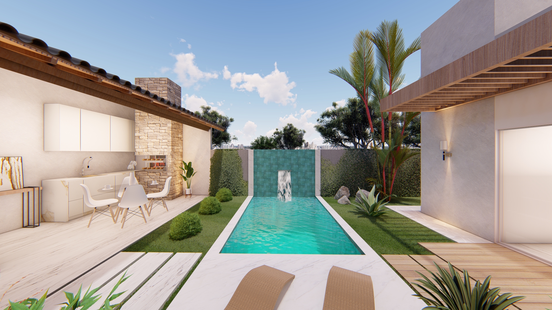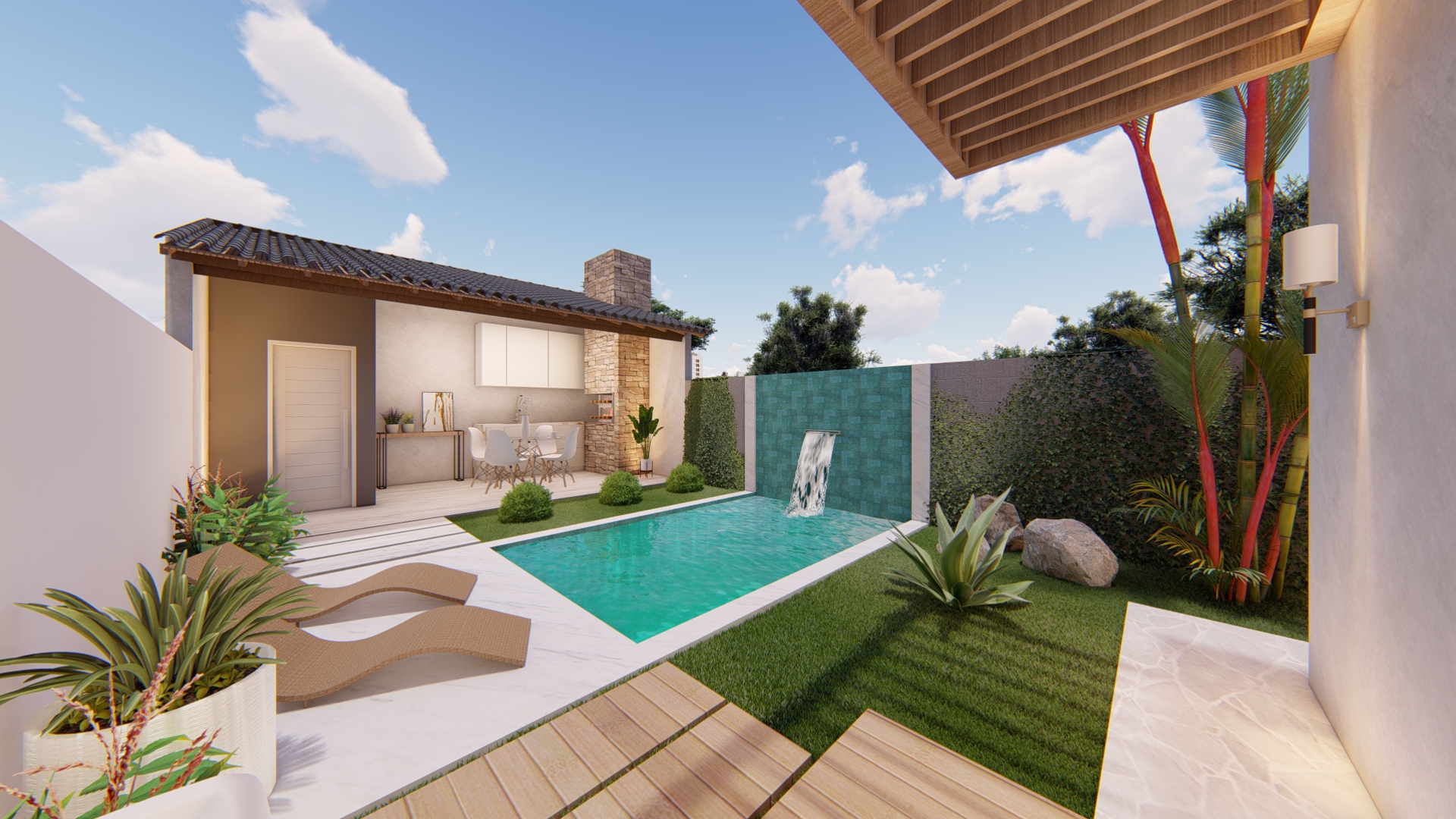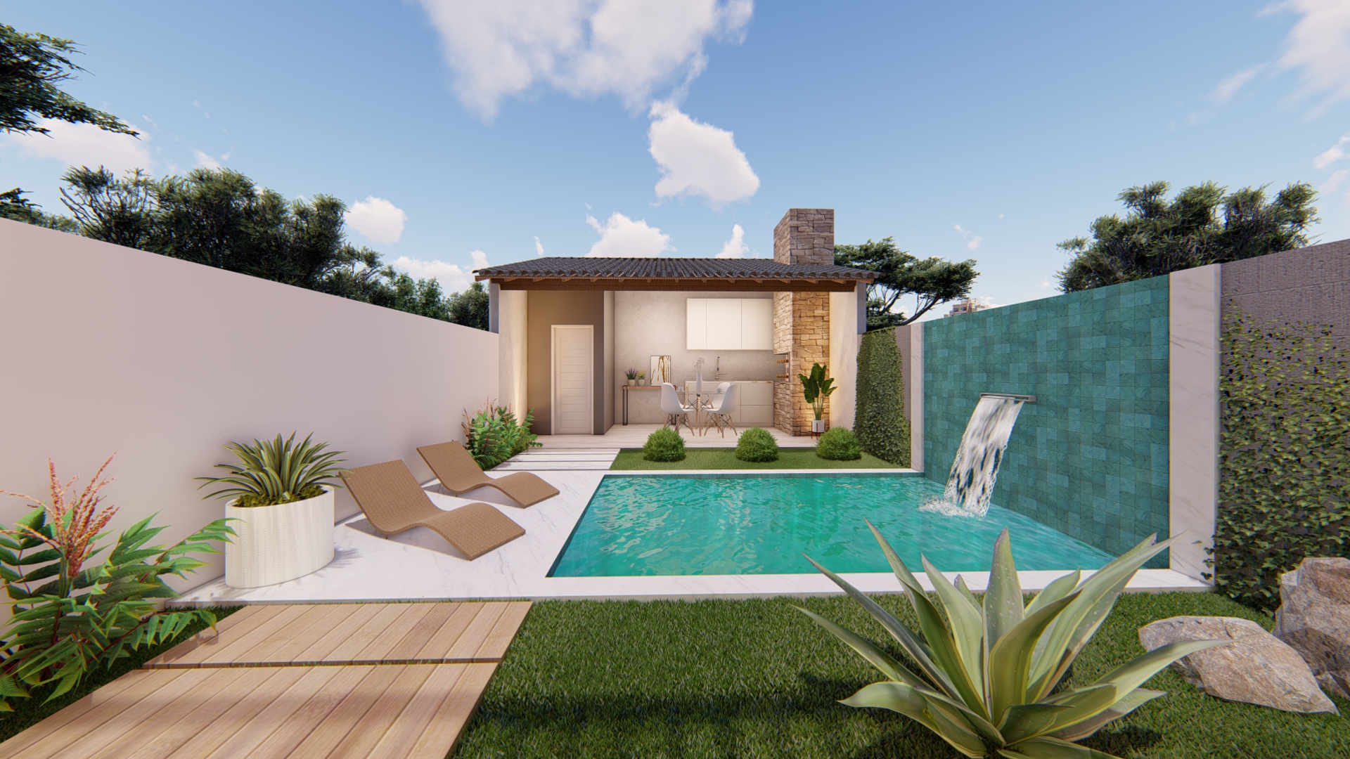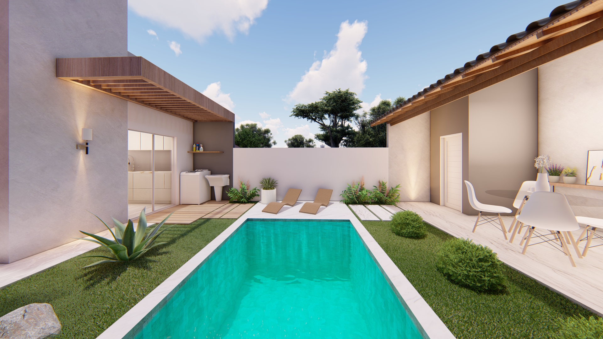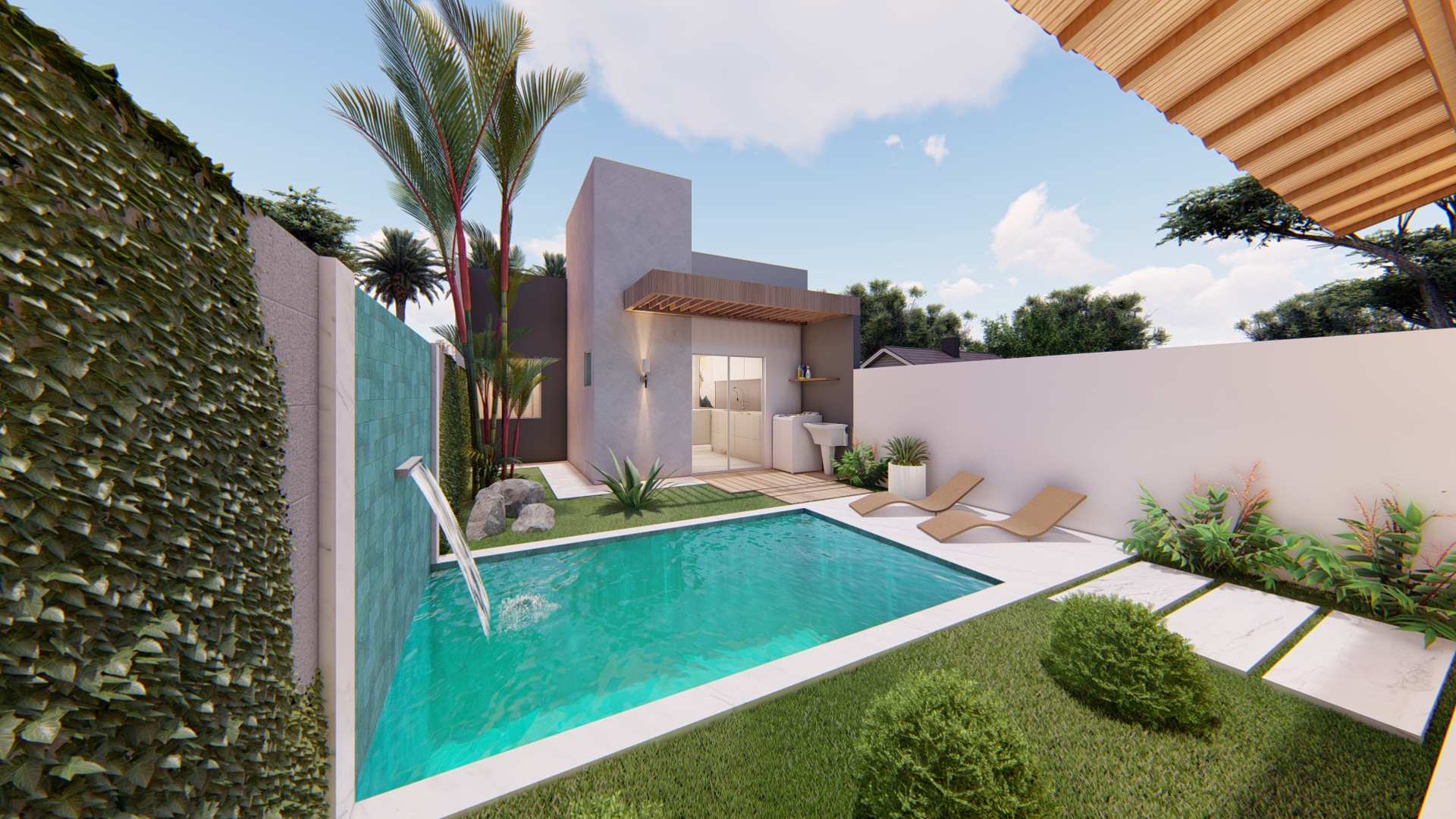 Projeto arquitetônico moderno de casa térrea, desenvolvido especialmente para terrenos estreitos. A planta contempla ambientes integrados com living espaçoso, cozinha americana e uma elegante área de lazer com piscina e espaço gourmet. Ideal para quem busca estilo, conforto e lazer em um espaço compacto.